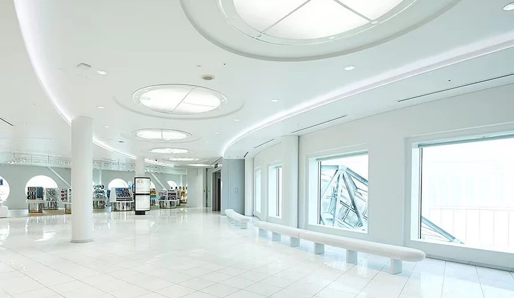 梅田藍天大廈以「空氣之城(City of Air)」為理念核心,象徵人、城市與天空的共生。東西雙塔以環狀屋頂相連,構築出懸浮於空中的「空中庭園」,中央挖空設計營造出輕盈漂浮的視覺感。從35樓通往39樓的透明手扶梯橫越高空,成為最受歡迎的夢幻打卡點。頂層展望台採360度全開放設計,讓人以最直接的感官擁抱風與光。1993年完工時,以吊掛方式將空中庭園固定於173公尺高空,創下日本建築史的里程碑,也展現原廣司在泡沫經濟衰退期間仍堅持理想的精神。
