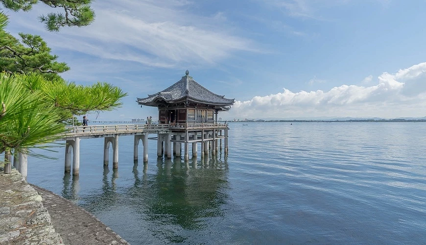 「浮御堂」的寺名是海門山滿月寺,為琵琶湖最知名的景點之一,自古以來就深受古代文人墨客的喜愛與歌頌,由於佛寺結構架高於湖面上,如同浮在湖上一般,非常夢幻。相傳浮御堂是平安時代的僧人源信為祈求湖上安全、普度眾生而修建。後來歷經1934年遭颱風又重建,現存建築則是1982年所重新修繕,仍保有昔日的佛堂之美。