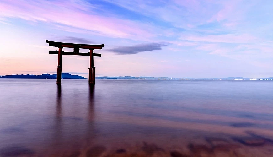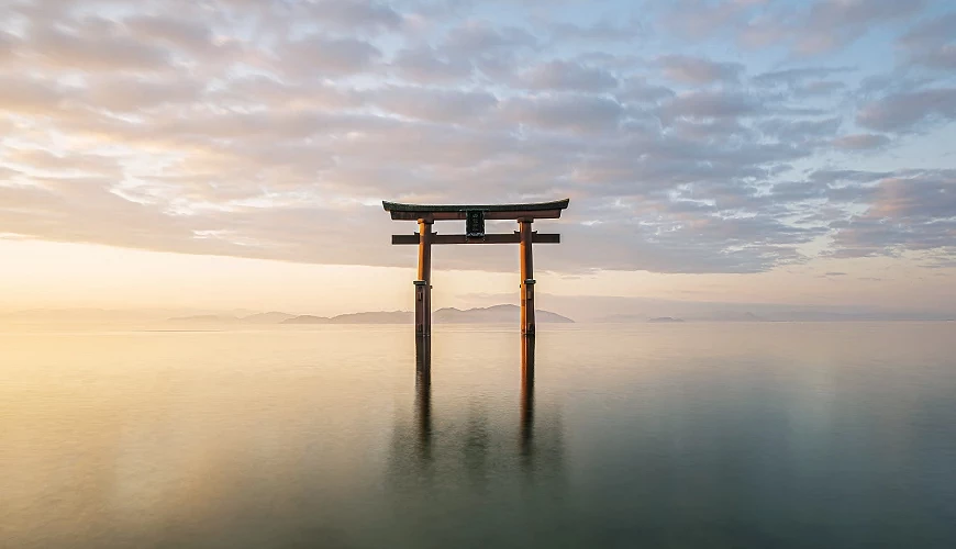 擁有近兩千年歷史的白鬚神社位於滋賀縣高島市,是近江地區最古老的文化遺產,主要祭祀長生長壽之神。白鬚神社最知名的景色就是矗立在湖中央的大鳥居,從清晨、夕照到深夜都有不同風采,日落後也會有約兩小時的夜間點燈時間,與粼粼波光相輝映,讓不少遊客都為了一睹絕景慕名而來。由於湖中鳥居的景色和廣島的嚴島神社非常像,因此這裡也有「近江嚴島」之稱。