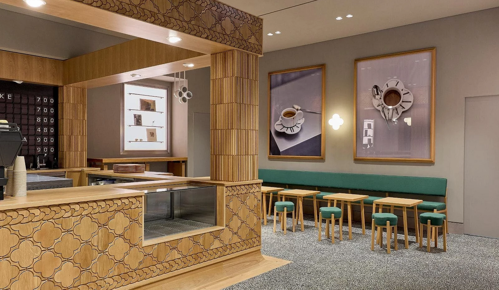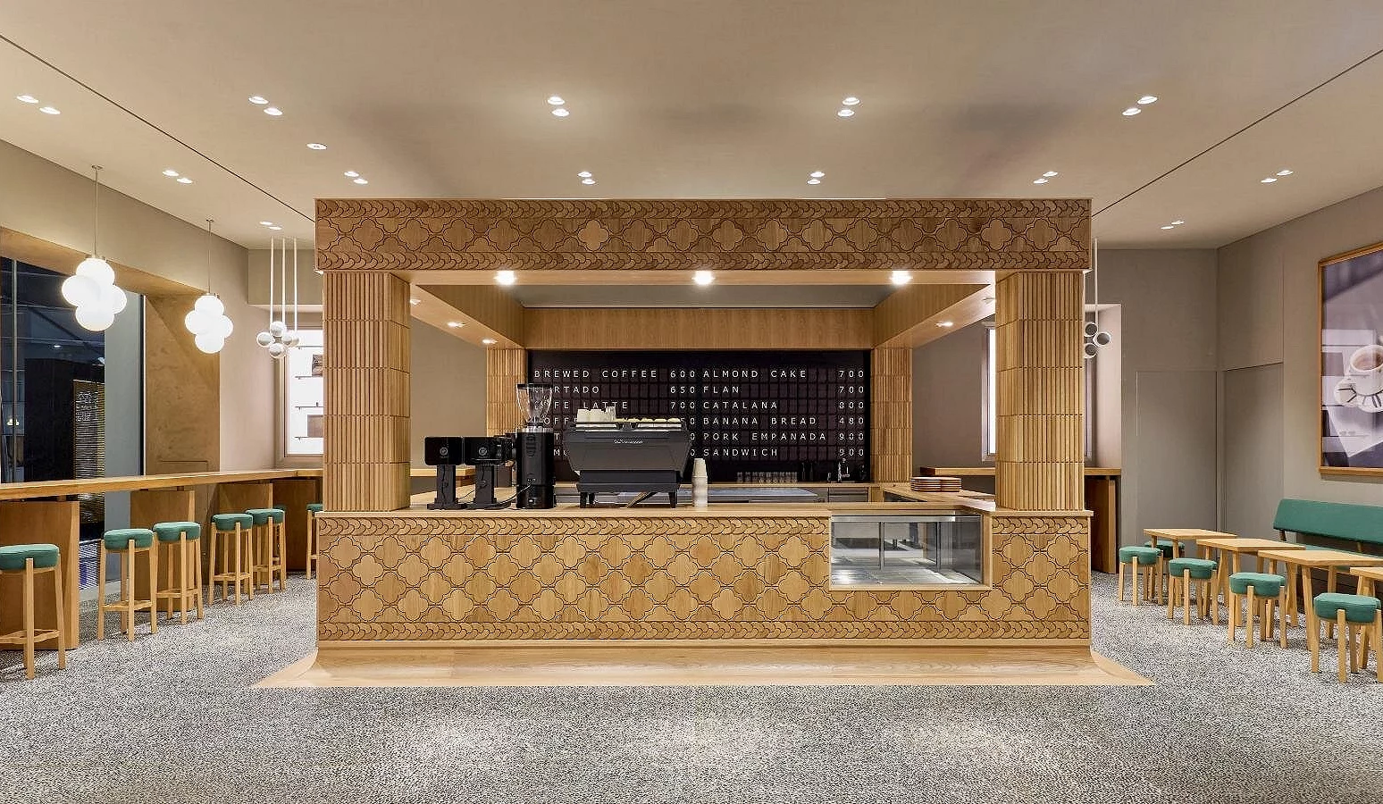 與旗艦店同棟設立的「Zacaffè」,是ZARA首次進軍日本咖啡市場的全新企劃。咖啡廳內部由日本設計團隊打造,以自然與靜謐為主題,選用奈良縣產木材、石材與土壁元素,呈現出質樸又高雅的空間。木質吧檯與溫潤的燈光交織出柔和氣氛,彷彿置身京都的隱密茶屋。