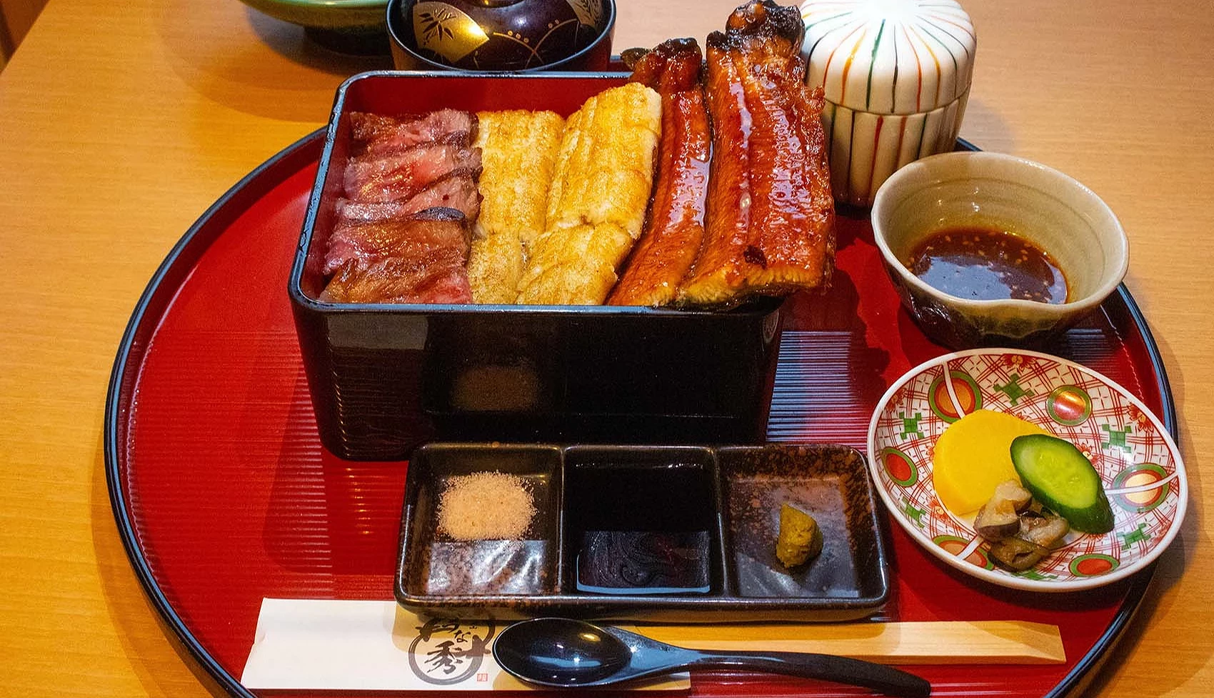 首先最推薦給讀者的,是奢華滿點的「三色重」(含稅10,000円)。這份餐點可一次品嚐三種高級的美味:香氣四溢的蒲燒鰻、感受原始鮮味的白燒鰻,以及多汁的日本國產牛。份量、口感跟味蕾都三重享受,讓人一口接一口停不下來!是來店不可錯過的必點料理。