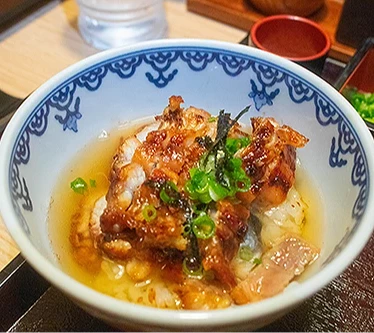 「鰻魚飯三吃」最迷人的,就是能享受三段式的風味變化。第一口先直接品嘗原味,感受鰻魚炭烤後的香氣與油脂。接著加入蔥花、山葵等藥味或醬汁,又是完全不同的層次。最後再淋上高湯,變成清爽順口的鰻魚茶泡飯,香氣與高湯的風味完美融合,讓人一口接一口。從頭到尾都有變化、完全不會膩!依照蒲燒鰻魚的份量多寡分為並(含稅5,000円)、上(含稅6,000円)兩種選擇。