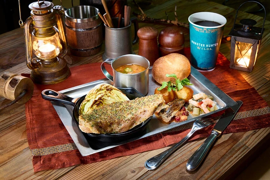 《魔物獵人荒野~莫利巴的宴會~》主題餐廳已於活動前搶先開跑,營運至2026年5月17日,重現遊戲中的森林營地氛圍,以營火、野外燈光與木造擺設打造逼真的用餐空間。餐點以遊戲世界觀為靈感呈現,讓粉絲像獵人一樣補給再出發。用餐後還能參加園區限定 AR 任務,透過手機探索園區、追蹤魔物、掃描線索,過程彷彿真實狩獵任務。完成挑戰後還可獲得限定獎勵,是粉絲必訪的完整沉浸式體驗。