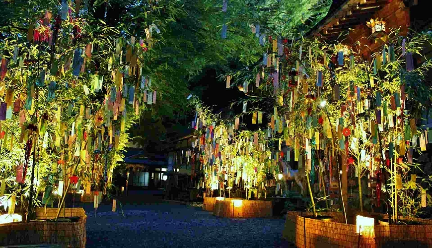 每年7月至8月中旬舉行的「七夕笹飾點燈(七夕笹飾りライトアップ)」,是貴船神社夏季限定的季節盛事。夜幕降臨後,竹飾、燈籠與御神水的倒影交織出夢幻光景,整個參道散發著浪漫氛圍,也讓人感受到京都山間夏夜的清涼與神聖。