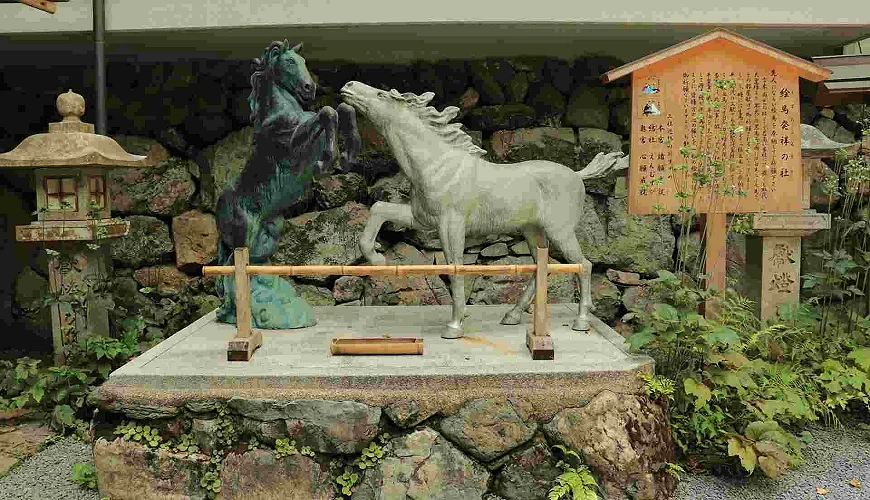 據傳貴船神社是日本繪馬(絵馬)的起源地。古時人們以真馬奉獻祈雨,後來改以木製馬牌代替,便成為今日的繪馬。神社內可購買繪有龍神或神馬的繪馬,寫上願望後掛到祈願處上以祈求願望成真。日本的「馬(うま)」讀音似「うまく(順利)」,寓意心想事成,是祈求事業、學業、戀愛順利的熱門護身符。