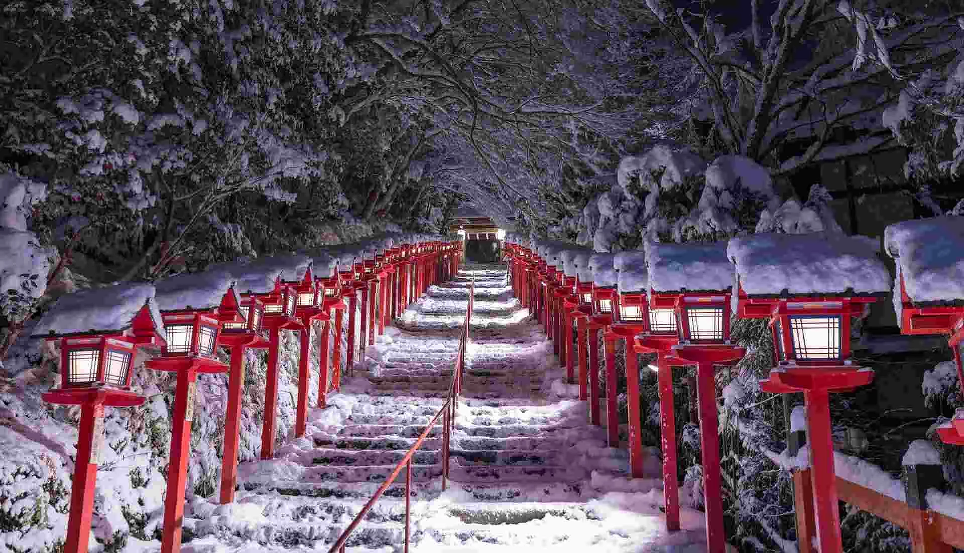 雪化妝的貴船神社,展現出與其他季節截然不同的寧靜神祕氣息。朱紅燈籠與雪白石梯相映,彷彿踏入幻想世界。冬天的貴船神社也是想參拜靜心、感受神聖氛圍的最佳拜訪季節。由於山區氣溫低且積雪機率高,建議穿著防滑鞋款並注意保暖。