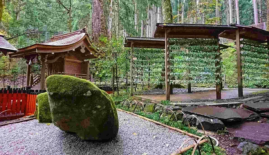 位於本宮與奧宮之間的「結社(中宮)」,供奉掌管良緣的磐長姬命,被視為戀愛與婚姻的守護神。傳說平安時代女詩人和泉式部在此祈願後與丈夫重修舊好,讓此地成為情侶與單身者必訪的戀愛聖地。遊客可在綠色結緣文紙上寫下願望,綁在結緣繩上便能祈求良緣及幸福。