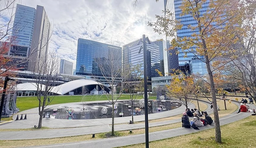 南北兩館中間的「梅北公園」佔地面積約45,000平方公尺(約13,000坪),除了綠意草坪與噴水廣場,還有結合花卉、色彩與光影設計的藝術裝置,讓人彷彿置身戶外美術館。白天可欣賞花園與裝置藝術交織的繽紛景色,夜晚則化身浪漫的光影舞台。坐在咖啡館露臺,邊啜飲拿鐵邊欣賞藝術與自然的交錯風景,即可體會「GRAND GREEN OSAKA」的從容與質感。
