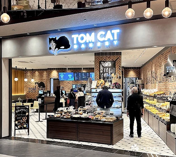 來自紐約的手工麵包名店「TOM CAT BAKERY」首度登陸關西,以美國紐約復古風設計打造出溫暖又時髦的烘焙空間。整面磚牆與黑貓標誌相映成趣,店內瀰漫剛出爐的麵包香氣。架上陳列著繽紛的甜甜圈、可頌、法國長棍等豐富的現烤麵包。其中「甜甜圈系列」特別受觀光客喜愛,口味豐富,如檸檬柳橙、抹茶黑豆、草莓巧克力等,外型可愛,最適合外帶。