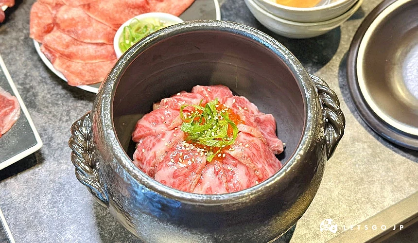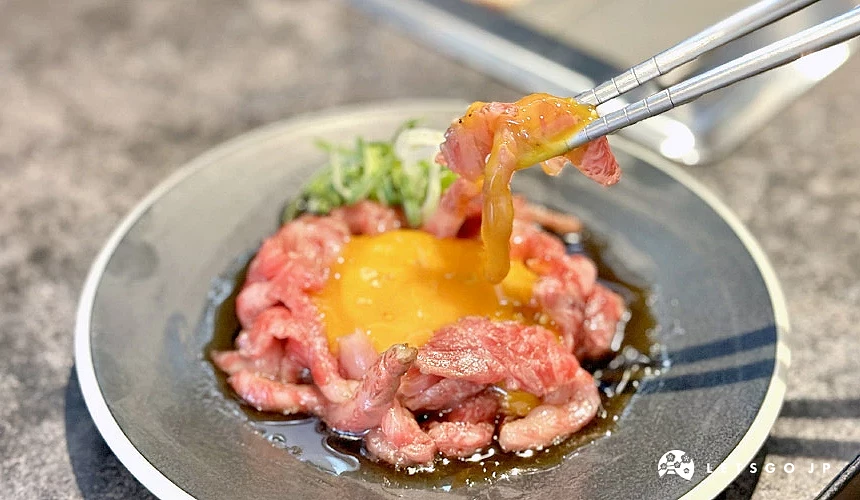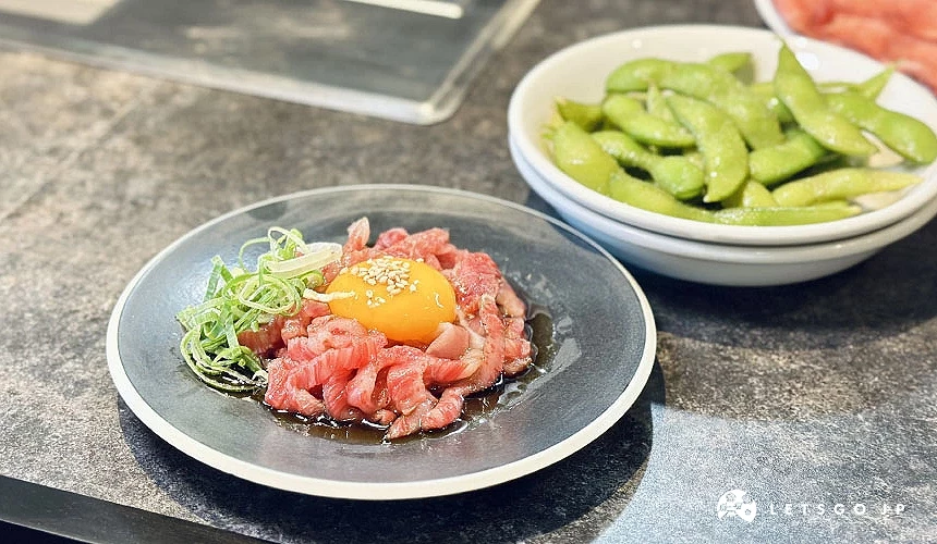 鮮紅色澤的「生拌牛肉(ユッケ)」一上桌就相當吸睛,軟嫩的牛肉拌上特調醬汁,鹹甜比例恰到好處。蛋黃攪拌後口感更加滑順,入口沒有一絲腥味,只留下鮮甜與油脂的柔和香氣。無論搭配飲品或在烤肉中場做口味轉換,都相當合適,是許多常客一吃就愛上的必點單品。