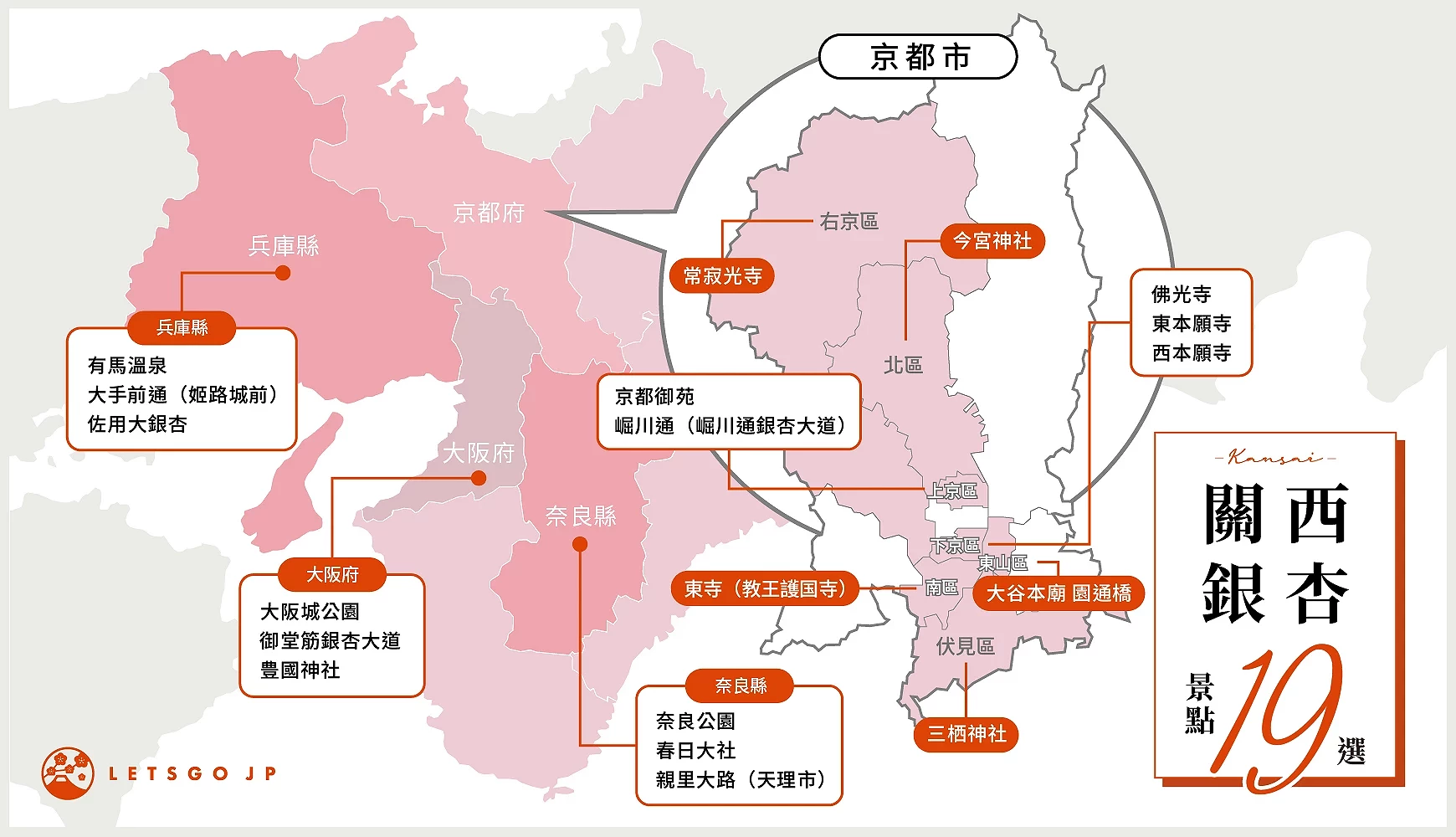 2025銀杏季節要到了,關西的京都、大阪、奈良跟兵庫都有壯麗的銀杏景點,以下就推薦當中19個最具的人氣銀杏景點:京都有西本願寺和東本願寺,兩邊的金黃各有風味;京都御苑跟奈良的春日大社都可以一次看到紅葉跟銀杏;大阪的御堂筋銀杏大道延綿4公里,甚有氣派;兵庫就推薦到有馬溫泉邊泡邊賞銀杏!